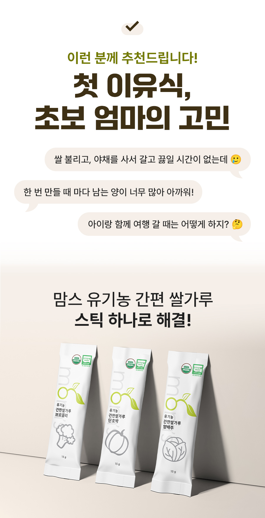 어디서든 간편하게 이유식 완성! 🍚 맘스 유기농 초기이유식 1단계 준비물 간편 스틱 쌀가루 쌀미음
