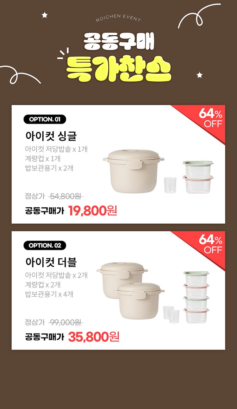 아이컷_저당밥솥 1+1세트 : 35,800원 (저당밥솥 2개 + 계량컵 2개 + 밥보관용기 4개)